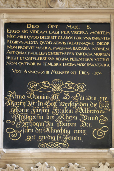 Das Hauptfeld des Epitaphs enthält die Inschrift mit den biographischen Angaben, zunächst ein lateinischer Teil in Kapitalis "DEO OPT:(IMO) MAX:(IMO) S.(ACRVM) / ERGO SIC VIDEAM LABI PER VISCERA MORTEM / NEC MIHI QVOD DEDERIT CLAROS FORTVNA PARENTES / REGIBVS AEDITA QVOD ATAVIS PALATINAQVE DICOR / NON PROFVIT MISERAE MAGNVM BAIOARIA NOMEN: / AST QVIA CRVDELEM CHRISTVS PER TARTARA MORTEM / FREGIT, ET OBTVLERAT SVA REGNA PETENTIBVS VLTRO / NON QVEROR IN TENEBRIS LVCEM MOX IPSA VISVRA / VIXI ANNOS XIIII MENSES XI DIES XV" - "geweiht dem besten und größten Gott / also sehe ich durch meine Eingeweide den Tod schlüpfen / auch ich, der mir das Schicksal illustre Eltern gegeben hat / der ich von Königen abstamme und Pfalzgräfin genannt werde / auch der große Name der Bayern nützt mir Elenden nichts / aber wie Christus den grausamen Tod durch das Leiden überwunden hat / und sein Königreich den Flehenden jenseits geöffnet hat / so jammere ich nicht in der Finsternis, weil ich ja bald selbst das Licht sehen werde / ich habe 14 Jahre, 11 Monate und 15 Tage gelebt", dann in gemischter lateinisch-deutscher Schreibweise und in Frakturbuchstaben "Anno Domini M D Liii Den xix / Martii Ist In Gott Verscheiden die hoch/gebor(e)ne Furstin Freülein Alberta / Pfalzgrefin bey Rheyn Vnnd / Hertzogin In Bayrn Der / se(e)len der Alm(a)echtig(e) ewig / got(t) gn(a)edig s(e)y Amen". So werden hier auf der zentralen schwarzen Schiefertafel ein siebenzeiliges Grabgedicht und eine ebenfalls siebenzeilige Grabinschrift kombiniert, für ein Kind, das nicht einmal 15 Jahre vollenden konnte.
