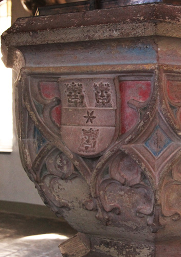 Taufstein von heraldischem Interesse, ca. 1490 entstanden. Er ist