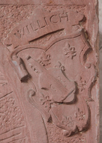 Rosinas Urgroßeltern waren väterlicherseits der Gundheimer Burgherr Johann Seifrid von Oberstein (1490-19.9.1556) und seine Frau, Margaretha Wilch von Alzey (1500-2.3.1563), die wir bereits von der anderen Grabplatte in dieser Kirche kennen. Entsprechend folgt auf der Schwertseite an dritter Position das einwärts gewendete Wappen der Wilch von Alzey ("wilch von / Altzen"), in Blau eine schräggestellte Laute, begleitet von hier sechs (2:2:2) goldenen Lilien (Oberwappen: zu blau-silbernen Decken eine wachsende blau gewandete Mohrin, in jeder Hand eine Pfauenfeder). Die beiden anderen Urgroßeltern väterlicherseits waren Paul Schliederer von Lachen, der zuerst in Deidesheim lebte, und der im Dienste des Speyerer Bischofs stand und der zweimal verheiratet war, erst mit Barbara von Sternenfels (hier nicht relevant), später mit Anna von Venningen. Und deren Wappen sehen wir auf der Schwertseite an vierter und letzter Position ("Venningen"), in Silber zwei rote, schräggekreuzte Lilienstäbe oder Glevenstäbe (Oberwappen: zu rot-silbernen Decken eine silberne Bischofsmütze, mit den schräggekreuzten zwei roten Lilienstäben belegt, oben mit schwarzen Hahnenfedern besteckt).