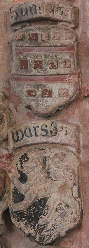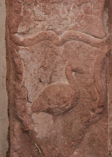 Westwand, vorgestellt werden. Das Material ist roter Sandstein.