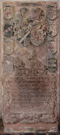 In den vier Ecken der Grabplatte sind insgesamt vier Wappen einer Ahnenprobe angebracht. Alle vier sind Margaretha von Oberstein zuzurechnen, keines verweist auf ihren vor ihr verstorbenen Ehemann, das war Gottfried von Franckenstein (1512-1567), der Sohn von Hans von Franckenstein (1492-1558) und Irmela von Cleen (1494-1533). Ihr gemeinsamer Sohn war Johann V. von Franckenstein (1537-), welcher Hildegard Nagel von Dirmstein heiratete. Es gab übrigens wesentlich später noch einmal eine Verbindung zwischen den Familien Franckenstein und Oberstein, Johann Daniel von Franckenstein (1615-1677) aus der Sachsenhausener Linie, kurmainzischer Oberamtmann in Amorbach, Buches und Walldürn, heiratete um 1650 Maria Margaretha von Oberstein. Hier geht es aber um die erstgenannte Verbindung, und die Verstorbene war 7 Jahre im in der Inschrift erwähnten Witwenstand.