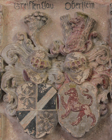Die Großeltern väterlicherseits waren Jeremias von Oberstein (-1507) und Dorothea von Erlenbach; die Großeltern mütterlicherseits waren Philipp Wilch von Alzey und Helene von Ehrenberg. Entsprechend zeigt der Schild heraldisch rechts unten das einwärts gewendete und stark verwitterte Wappen der von Erlenbach ("(E)RLE(N)BACH", einzelne Buchstaben abgewittert), in rotem Feld eine silberne, golden bewehrte Gans (Oberwappen: zu rot-silbernen Decken der silberne, golden bewehrte Kopf und Hals einer Gans zwischen einem roten Flug). Es ist ein seit dem 15. Jh. erwähntes Geschlecht, das seinen Stammsitz in Erlenbach nördlich von Frankfurt hatte (heute aufgeteilt zwischen Bad Homburg und Frankfurt). Cave - es gibt noch zwei andere Familien des Namens im Nassauischen, die aber andere Wappen führen. Die Familie ist 1507 mit Dieter von Erlenbach erloschen. Der Schild gegenüber trägt das Wappenbild der Herren von Ehrenberg ("ERNBERG", der dritte Buchstabe eine Ligatur aus H und N), in Silber ein roter Adlerflügel, die Saxen nach oben gekehrt, rechts in einen golden geschnäbelten Vogelkopf auslaufend, der Flügel belegt mit einer goldenen Mondsichel (Oberwappen: zu rot-silbernen Decken ein Schaft, oben mit einem Pfauenstoß besteckt, zwischen zwei abgekehrten goldenen Stiefeln)