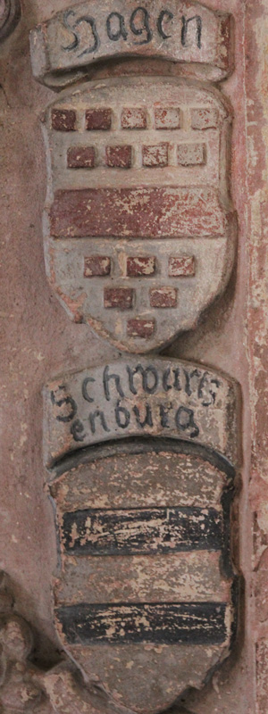 Nur eine einzige Fläche an der Schauseite ist anders gestaltet, da fehlen die beiden oberen mittleren Hälften der S-Kurven und sind durch einen Wappenschild der Stifter ersetzt. Dort ist eine Variante des Wappens der Herren von Fürstenberg zu sehen. Sie führten üblicherweise in Gold einen schwarzen Balken, von drei roten, blau oder silbern gekrönten Leopardenköpfen (= hersehenden Löwenköpfen, Löwenmasken) begleitet, Kleinod nach dem Holzhausen-Epitaph von 1553 ein Flug, nach dem Frankfurter Wappenbuch der Gesellschaft Alten-Limpurg ist es zu rot-goldenen Decken ein roter, silbern gekrönter Leopardenkopf (eine Löwenmaske), aus der Krone hervorkommend ein silberner Flug. Hier ist der Balken im Schild noch zusätzlich mit einem Stern belegt.