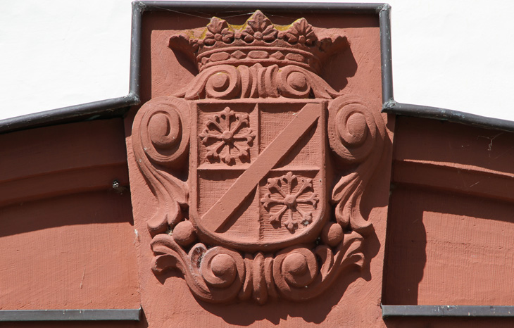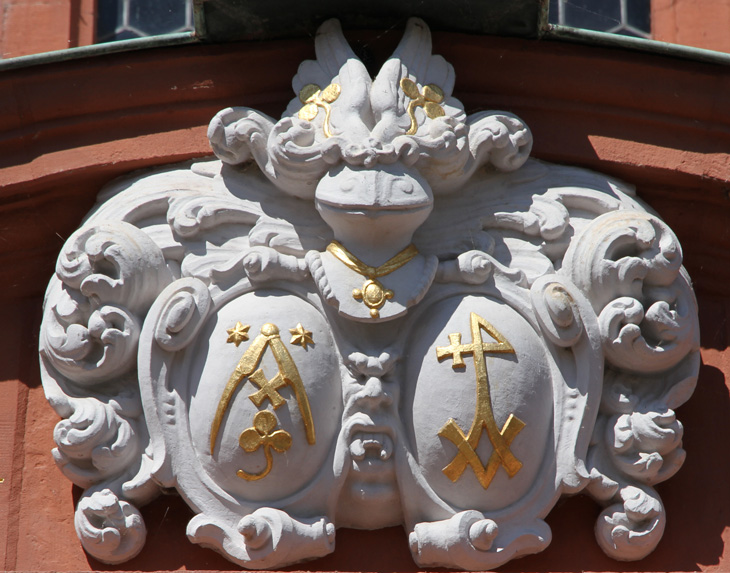 An der Figur der St. Barbara auf der Südseite des Langhauses sehen wir die Kombination der Wappen Greiffenclau-Vollrads (geviert: Feld 1 und 4: Greiffenclau-Vollrads, silbern-blau geteilt, darüber ein goldenes Glevenrad, Feld 2 und 3: Ippelbrunn = Eppelborn, in Schwarz ein silberner Schräglinksbalken) und Kottwitz von Aulenbach (in Silber ein silbern-schwarz geteiltes Bockshorn). Die gleiche Wappenkombination ist auch am Sockel der St. Katharina angebracht, ebenfalls auf der Südseite. Die gleiche Wappenkombination ist auch an Schloß Vollrads in einem Zwerchgiebel der Wirtschaftsgebäude angebracht, ebenso am barocken Gebäude, in dem heute das Restaurant eingerichtet ist. Das paßt zu dem oben genannten Johann Erwein Freiherr von Greiffenclau-Vollrads (1663-1727) und seiner zweiten Ehefrau, der in Mainz am 8.2.1705 geehelichten Maria Catharina Freiin Kottwitz von Aulenbach (-24.10.1715), der Tochter von Johann Friedrich Freiherr Kottwitz von Aulenbach und Anna Beatrix von Reinach. Aus dieser zweiten Ehe des Johann Erwein entstammt Johann Philipp Joseph Ignaz von Greiffenclau-Vollrads (17.5.1706-21.10.1715), der die Familie aber nicht fortsetzte. Doch damit nicht genug, Johann Erwein sollte noch zweimal heiraten, in dritter Ehe Maria Anna Magdalena Gräfin Waldbott von Bassenheim (-5.3.1719) und in vierter Ehe Maria Dorothea Freiin von Franckenstein (-9.1.1756), die ihn dann lange überlebte. Aus dieser letzten Ehe entstammen der Wormser, Mainzer und Würzburger Domherr Damian Hugo Casimir Friedrich von Greiffenclau-Vollrads (5.6.1723-11.3.1786), der Würzburger Domherr Philipp Ernst Marsil Ferdinand von Greiffenclau-Vollrads (30.6.1724-), der Speyerer Domherr Franz Carl Philipp Anton von Greiffenclau-Vollrads (1726-8.12.1787) und der kurmainzische Kammerherr, Hof- und Regierungsrat, Ritterhauptmann des Kantons Wetterau, Adolf Wilhelm Franz Freiherr von Greiffenclau-Vollrads (1727-25.5.1763), der aufgrund seiner Heirat am 16.4.1759 eine Namens- und Wappenvereinigung mit den Frey von Dehrn vornahm.