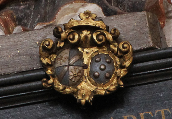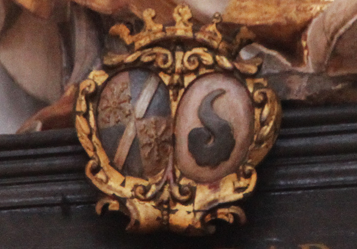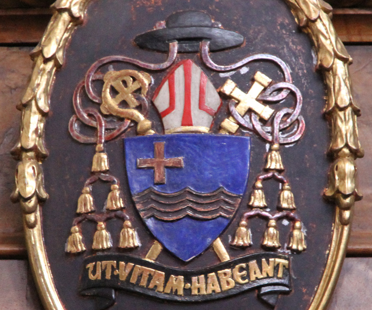 An dem Altar der Schmerzhaften Mutter vom Ende des 17. Jh. an der Nordwand des Langhauses mit einer Darstellung der Pietà ist ein modernes Wappen. Auch wenn die Geschichte von Oestrich-Winkel untrennbar mit den Mainzer Fürstbischöfen verbunden ist, gehört dieses Wappen jedoch zu einem ganz anderen Bistum, nämlich Limburg. Wir sehen das Wappen des Limburger Bischofs Ferdinand Dirichs (24.11.1894-27.12.1948, amtierte 1947-1948), das aufgrund seiner kurzen Amtszeit höchst selten zu finden ist. Der Schild zeigt in Blau einen erniedrigten silbernen Wellenbalken (nach anderen Darstellungen eine silberne Drillings-Wellenleiste), rechts oben überhöht von einem silbernen Tatzenkreuz. Dazu wird im hier vorliegenden Fall eine silberne, rot verzierte Mitra, ein schrägrechts gelegter Krummstab und ein schräglinks gelegtes Prozessionskreuz geführt, über allem ein Galero mit beiderseits je 6 (1:2:3) Fiocchi. Nach der üblichen Farbcodierung katholischer Bischöfe müßten Galero und Fiocchi grün sein, das ist hier nicht der Fall, hier sind in der aktuellen Farbfassung der Galero unüblich schwarz, die Knotenschnüre rot und die Fiocchi golden. Die Devise lautet UT VITAM HABEANT - damit sie das Leben haben.