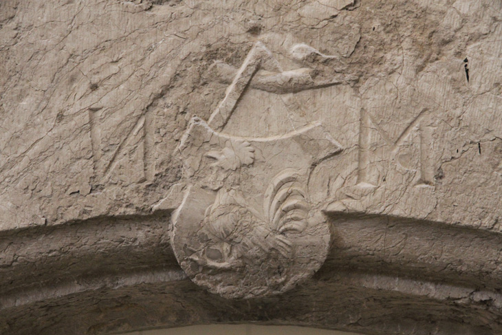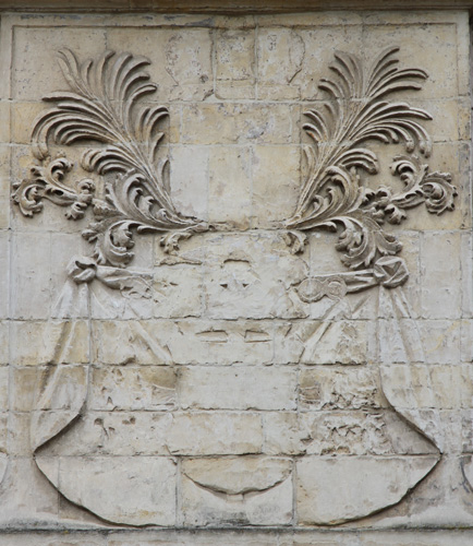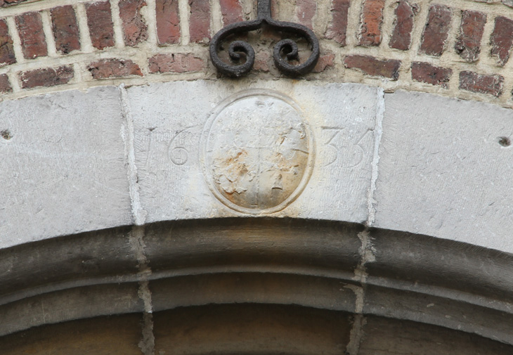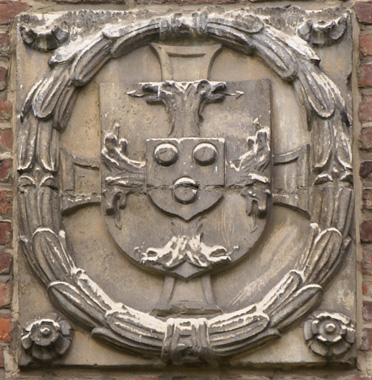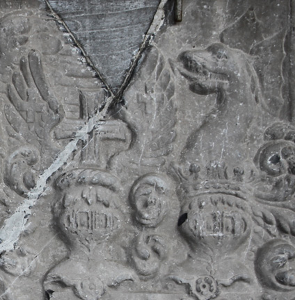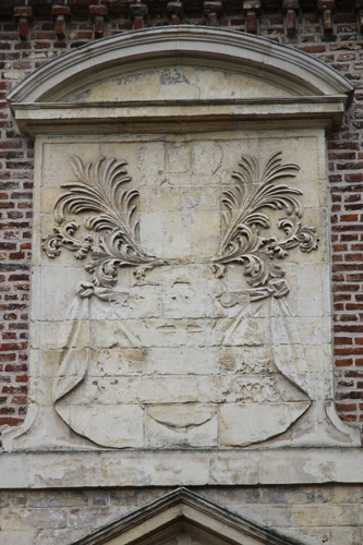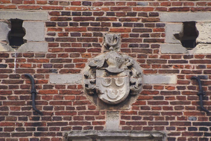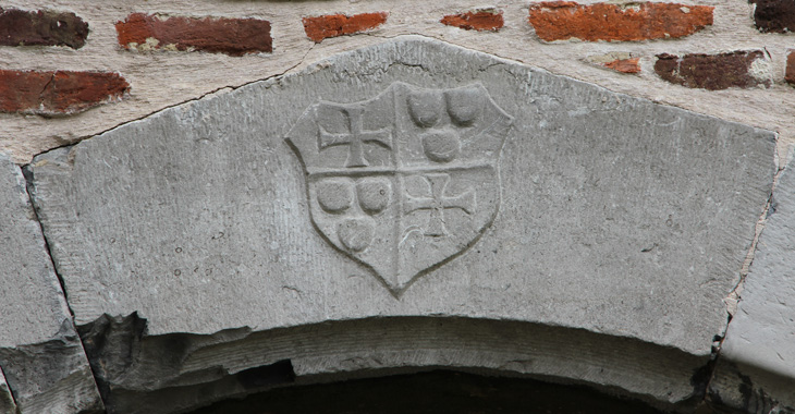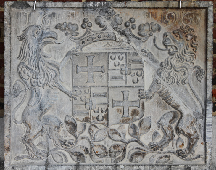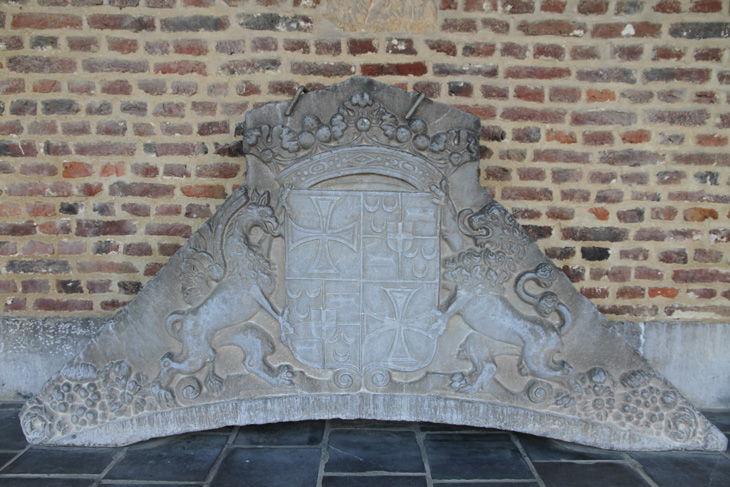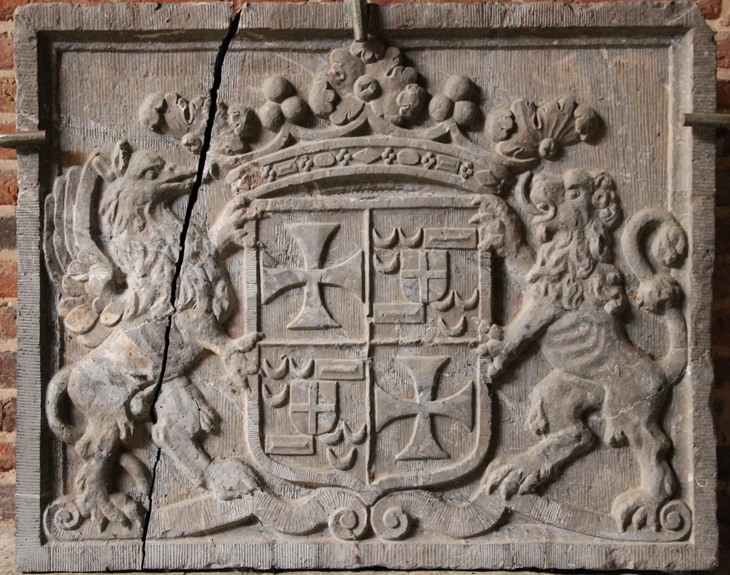 Abb.: Undatierte Spolie in der Durchfahrt durch den Südostflügel des Wasserschlosses, in der rechterhand und linkerhand in den Mauernischen ein kleines Lapidarium eingerichtet ist, mit dem Wappen des Landkomturs Jan van Goer, rechts Detailausschnitt. Es ist eines der seltenen Wappen, die auch das Kleinod zeigen.