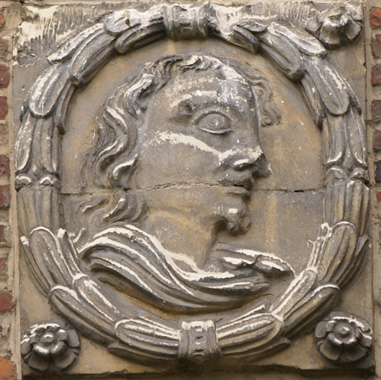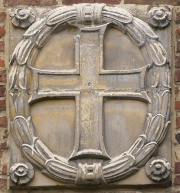 Abb.: Am Glockenturm ist in situ das des Landkomturs Jan van Goer in das Ziegelmauerwerk eingelassen, über den beiden Fenstern der obersten Stockwerke und unterhalb der Wehröffnungen der obersten Ebene.