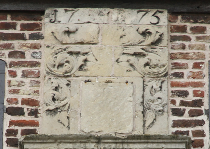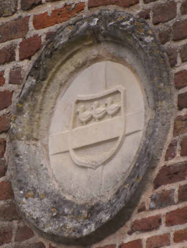 Dieses Wappen ist dasjenige an der Nordostseite des Glockenturmes. Die anderen drei Seiten waren früher auch mit solchen Wappen versehen, sie sind aber nicht mehr alle vorhanden. Das an der Nordwestseite ist abgeschlagen. Die großen Mengen Ziegel für den Bau des Wasserschlosses konnten übrigens vor Ort gebrannt werden, weil es Lehmschichten auf dem Gut und in der Umgebung gab.