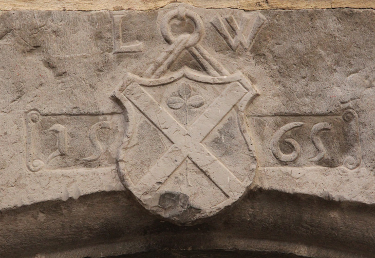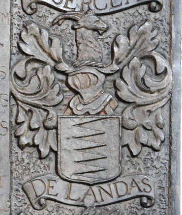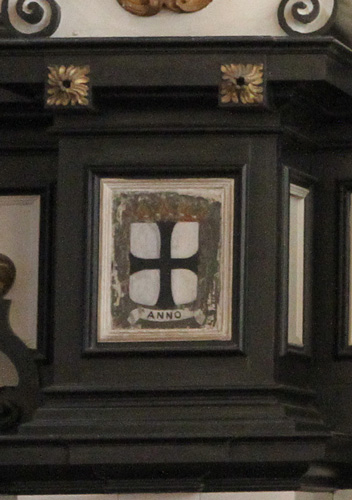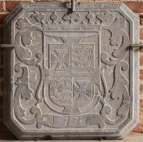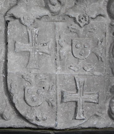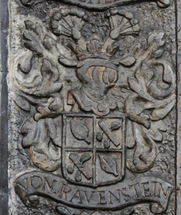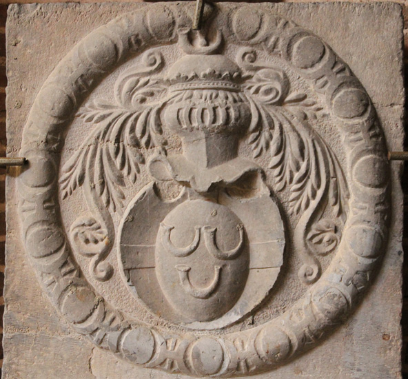 Das Wappen dieses Landkomturs kommt an zwei Stellen vor, einmal in situ am Glockenturm (ehemals sogar an allen vier Seiten), und einmal als Spolie im kleinen Lapidarium rechterhand in der Durchfahrt zum Wasserschloß-Innenhof.