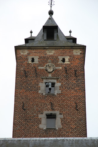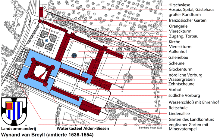 Abb.: Wasserschloß, Innenhof, unterstes Stockwerk des Glockenturms, zwei verschieden hohe Türen nebeneinander: Der Schild über der höheren Tür zeigt drei Pfähle, von einem Freiviertel überdeckt. Dieser Wappenstein aus dem 16. Jh. läßt sich Landkomtur Wynand van Breyll (amtierte 1536-1554) zuordnen. Laut Rietstap ist der Schild silbern mit drei blauen Pfählen und einem roten, golden bordierten rechten Obereck. Die Abb. unten zeigt sein Wappen einmal als reines Familienwappen wie hier am Treppenturm und einmal als Komturswappen, wie er es auch hätte führen können. Ein Vergleichswappen ist am niederländischen Kasteel Wolfrath in Holtum zu finden als Teil eines Ehewappens. Neben diesem Komturswappen befindet sich dasjenige seines Verwalters (siehe weiter unten).