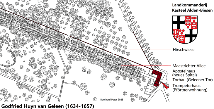 Diese Baugruppe liegt ca. 30 m höher als das Schloß. Früher trafen sich an diesem Punkt sieben Alleen, davon sind sechs noch nachvollziehbar. Eine Kastanienallee führt entlang der Gutsmauer nach Bilzen, eine Nußbaumallee führte nach Martenslinde, und eine Pappelallee führte nach Spouwen, aber dieser Weg ist heute stillgelegt. Eine Eichenallee führte nach Maastricht. Eine Ulmenallee führt in Richtung Weert. Die heutige Bosselaerstraat führt nach Süden in Richtung Tongeren. Diese Baugruppe steht an einem der höchsten Punkte der Region 112 m über dem Meer, und von dort oben hat man einen schönen Blick auf die geschützt in den Tälern liegenden Ortschaften, bei gutem Wetter bis zur Basilika von Tongeren. Man sieht aber auch Spuren der Industrielandschaf Mittellimburgs, die Abraumhalden der Kempener Kohlegruben, die Schornsteine eines Kraftwerks und den Fernsehturm von Genk. Von diesem Tor aus führte eine der Alleen in Richtung Maastricht, wo die Tochterkommende Neuenbiesen lag. Alle Wege führten sozusagen zum zentralen, höchsten Punkt, den Mittelpunkt eines Sternes von geradlinig abführenden Straßen bzw. Alleen. So wird der Zugang zur Landkommende zum Mittelpunkt der umliegenden Kulturlandschaft.