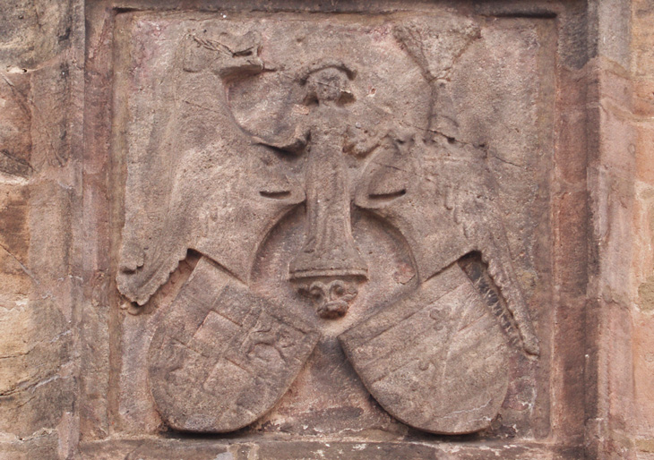 Bildbeispiel: Cadolzburg, äußeres Tor, Wappen für Markgraf Johann von Brandenburg (1406-1464), genannt der Alchimist (Wappen komplett gewendet), und seine Ehefrau Barbara von Sachsen-Wittenberg (-10.10.1465)