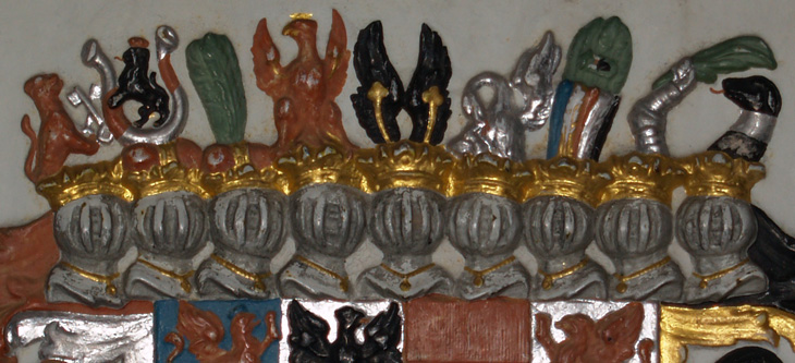 Bildbeispiel: Stiftskirche Aschaffenburg, Gedächtnisanlage für Albrecht von Brandenburg, Einzelwappen für die Grafen von Hohenzollern und das Burggrafentum Nürnberg.