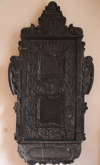 Ganz unten im Sockelbereich befindet sich eine weitere Inschrift des Wortlauts "ACH, WIE, NICHTIG ACH, WIE, FLVCHTIG, SIND, DER, MENSCHEN / SACHEN, ALLES, ALLES, WAS, WIR, SEHEN, DAS, MVS, FALLEN, VND, / VERGEHEN, WER, GOTT, FVRCHT, WIRD, EWIG, STEHEN / DER, GERECHTE, KOMPT VMB, VND, NIEMAND, IST, DER, ES, ZV, HERTZEN, NEHME, VND, HEILIGE / LEVTE, WERDEN, WEGGERAFT, VND, NIEMAND, ACHTET, DRAVF DAN, DIE, GERECH : / TEN, WERDEN, WEGGERAFT, FVR, DEM, VNGLVCK, VND, DIE, RICHTIG, FVR SICH GEWA: / NDELT, HABEN, KOMMEN, ZVM, FRIEDE, VND, RVHEN, IN, IHREN, KAMMERN.", ein allgemeines Wehklagen über die Vergänglichkeit, in der man für den ersten Teil eine Quelle in der 13. Strophe eines von Michael Franck geschriebenen Kirchenliedes findet, und deren zweiten Teil seine Wurzeln in Jesaja 57, Vers 1-2 hat: "Der Gerechte ist umgekommen und niemand ist da, der es zu Herzen nimmt, und fromme Leute sind hingerafft und niemand achtet darauf, denn der Gerechte ist weggerafft durch die Bosheit und geht zum Frieden ein. Es ruhen auf ihren Lagern, die recht gewandelt sind".