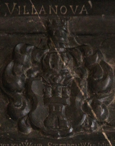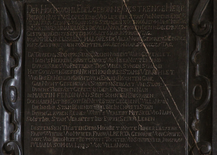 Darunter folgen zwei große rechteckige Inschriftenfelder für die biographischen Daten, das obere für den Ehemann, das untere für die Ehefrau, wobei die zweite Inschrift nie nachgetragen wurde. Also lesen wir in dem oberen großen Feld: "DER HOCHWOHL EDEL GEBORNE GESTRENGE HERR / FRIDRICH IVSTVS LOPES, EINIG VND LETZTER STAM VND NAMENS ERBE VO(N) / VILLANOVA. GEBORE(N). 26. IAN: I626. STARB DEN 7. OCT. I666. ALT 40. IAR. 8 MON. II TAG, / IR. MARTIN FERDINAND LOPES DE VILLANOVA. GEBOREN DEN 30 DECEMB. I659. /GESTORBEN DEN 25 SEPTEMB. I666. ALT 6 IAAR. 8 MONAT. 5 TAG. / IFR. AMMELIA ELISABETHA LOPES DE VILLANOVA GEBOREN DE(N) 26 IVLII / I652. GESTORBEN DEN 20 SEPTEMB. I666. ALT I4 IAAR. I MONAT. 25 TAG. / DA TAUSEND, SECHZIG SECHS, SECHSHVNDERT WARD GEZEHLET. / NACHS HERREN CHRIST GEBVRT, VND VNSER VATTERLAND / DVRCH KRIEGE VND PESTILENZ TRUG VNSER SÜNDEN SCHAND, / HAT GOTT AVCH DIESER NICHT, NOCH IHRES STAMS VERFEHLET, / VND, DAS ER HERLICH GRÜNT, AVCH EHLICH FRÜCHTEN GABE, / GAR NICHT GESEHEN AN, SONDERN SEIN AST VND STAM / DVRCHS TODES AXT GEFELT, INDEM ER SEINEN / NAM IN MARTIN FERDINAND SEIM SOHN SAH BEGRABEN, / DOCH ABER HAT IHN GOTT DIE NEVE STATT GEGEBEN / DIE IHN IHR STAM BENENDT, WEIL SIE IN CHRISTI STAM / DVRCH GLAVBEN REINES WORTS VERBLEIBT MIT SEEL VND NAM / SO IST IHR STAM VERSETST INS EWICH SELICH LEBEN. / DESSEN SICH TROSTEN DERO HOCHBETRVBTE HINDERLASSENE / FRAW WITTIBE VND MVTTER, FRAW ALBERTA, GEBORNE VON GVNTTE: / RODT, VND DERO HERTZBETRVBTE TOCHTER VND SCHWESTER, IVNGFRAV / IULIANA SOPHIA LOPES VON VILLANOVA." Man beachte das Wortspiel Villanova = die neue Stadt gegeben.