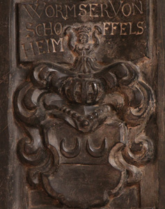Abb. Mitte: Wappen der Position 16: Wurmser von Vendenheim bzw. Schaeffolsheim ("WORMSER VON SCHO FFELS HEIM"), eine elsässische Familie, die auch im Straßburger Patriziat vertreten war, schwarz-golden geteilt, oben zwei liegende, silberne Mondsicheln nebeneinander, auf dem gekrönten Helm mit schwarz-goldenen Decken ein wachsender gekrönter Frauenrumpf, anstelle der Arme zwei goldene Büffelhörner, das Gewand schwarz-golden geteilt, oben zwei liegende, silberne Mondsicheln nebeneinander. Das Wappen wird beschrieben im Siebmacher Band: Bad Seite: 27 Tafel: 18 und Band: Els Seite: 23 Tafel: 27, und es ist auch in einem Stett- und Ammeisterbuch der Stadt Straßburg abgebildet. Rietstap gibt an: "Coupé de sable sur or le sable chargé de deux croissants montants d'argent accostés. Casque couronné. Cimier une femme issante couronnée d'or habillée aux armes de l'écu les bras remplacés par deux proboscides d'or. Lambrequin d'or et de sable." Hinter dem genannten Schoffelsheim verbirgt sich der elsässische Ort Schaeffolsheim, wo die Wurmser Besitzungen hatten.