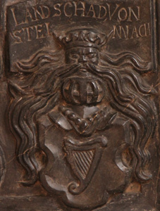Abb. rechts: Wappen der Position 18: Landschad von Steinach ("LANDSCHAD, VON STEI NNACH") aus dem Neckar-Raum, in Gold eine schwarze Harfe, auf dem ungekrönten Helm ohne Decken ein golden gekröntes, bärtiges Manneshaupt (Königshaupt, Haupt des Königs David) mit wallendem goldenem Haar, welches die Helmdecken ersetzt. Das Wappen wird beschrieben bei Otto Hupp, Münchener Kalender 1909, und im Aschaffenburger Wappenbuch.