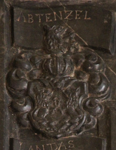 Abb. Mitte: Wappen der Position 3: Familie Appenzeller ("ABTENZEL") aus St. Gallen, Schweiz, golden-blau geviert mit zwei gegeneinander aufspringenden Löwen in verwechselten Farben, auf dem Helm mit blau-goldenen Decken ein wachsender goldener Löwe. Es gibt in der Schweiz mehrere Varianten des Wappens für verschiedene Familien Appenzeller, darunter auch solche mit einem Schildhaupt, das mit drei Kugeln nebeneinander belegt ist, die meisten dieser Varianten werden von Züricher Familien geführt.