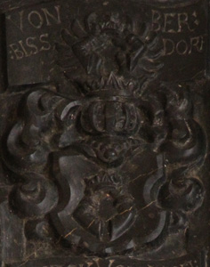 Abb. Mitte: Wappen der Position 4: von Berbisdorf ("VON BER: :BISS DORF") aus Böhmen und Schlesien, rot-schwarz gespalten, auf der Spaltungslinie ein goldener Stern (hier nicht zu erkennen), unter demselben eine goldene Krone, gehalten von zwei in verwechselte Farben gekleideten Menschenarmen, auf dem Helm mit schwarz-roten Decken die Schildfigur vor einem rechts roten, links schwarzen Flug. Nachweise des Wappens im Siebmacher Band: Bad Seite: 44 Tafel: 27, Bö Seite: 215 Tafel: 93, Band: PrAE Seite: 5 Tafel: 2, Band: SaA Seite: 13 Tafel: 8, Band: ThüA Seite: 50 Tafel: 38 und im Rietstap.