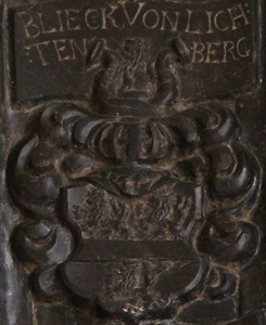 Abb. rechts: Wappen der Position 6: Blick von Lichtenberg ("BLIECK VON LICH: :TEN BERG") aus dem Pfälzer Bergland, nach der Burg Lichtenberg (Lkr. Kusel), in Schwarz ein silberner Balken, begleitet von 3 (2:1) gekrönten, goldenen Löwen, auf dem Helm mit schwarz-silbernen Decken ein sitzender goldener Löwe zwischen zwei schwarzen Büffelhörnern, diese belegt mit einer silbernen Binde.