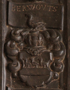 Abb. links: Wappen der Position 7: Familie Berwouts ("BERWOVTS") aus Brabant, in Rot ein silberner Balken, oben begleitet von drei goldenen Merletten, auf dem Helm einer der Vögel aus dem Schild. Rietstap gibt das Wappen ohne Kleinod wie folgt an: "De gueules à la fasce d'argent, accompagnée de trois merlettes d'or, rangées en chef".