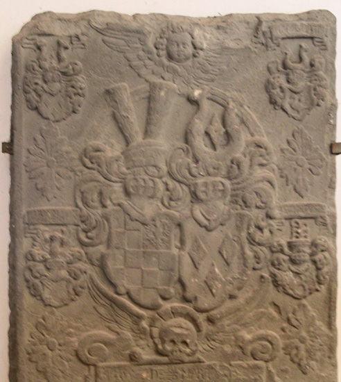 Diese im unteren Teil stark verwitterte Grabplatte hat eine lange und wechselhafte Geschichte. Erst wurde sie für den Ober-Ingelheimer Schultheißen Michael Haberkorn von Zellingen (-1527) angefertigt, dann wurde sie umgedreht und noch einmal auf der anderen Seite behauen, diesmal als Grabplatte für Anna Catharina von Wallbrunn (22.12.1617-1652), dann wurde sie aus der Kirche verbracht und im Hof des Hauses Ringgasse 16 aufgestellt, und von da wurde sie wieder in die Kirche zurückgebracht, um jetzt in der hintersten Ecke halb hinter Stuhlstapeln verborgen zu sein. So kommt es, daß wir heute nur die ursprüngliche Rückseite sehen. In der Mitte gibt es ein Ehewappen, bestehend aus zwei Vollwappen, über einer Inschriftentafel, und an den beiden Seiten gibt es insgesamt 8 Vollwappen einer Ahnenprobe, alle mit darüber befindlichen Schriftbändern namentlich zugeordnet, bei verwitterungsbedingt eingeschränkter Lesbarkeit. Die kaum noch lesbare Inschrift lautet: "Anno 1652 den ... Martii im 34 Jahr ihres Alters ist in Gott seeliglich entschlafen die wohledel geborne Frau Anna Catharina Wölfin von Sponheim geborne Walbrunn ......" Anna Catharina von Wallbrunn war vermählt mit Hans Wolf von Sponheim dem Jüngeren.