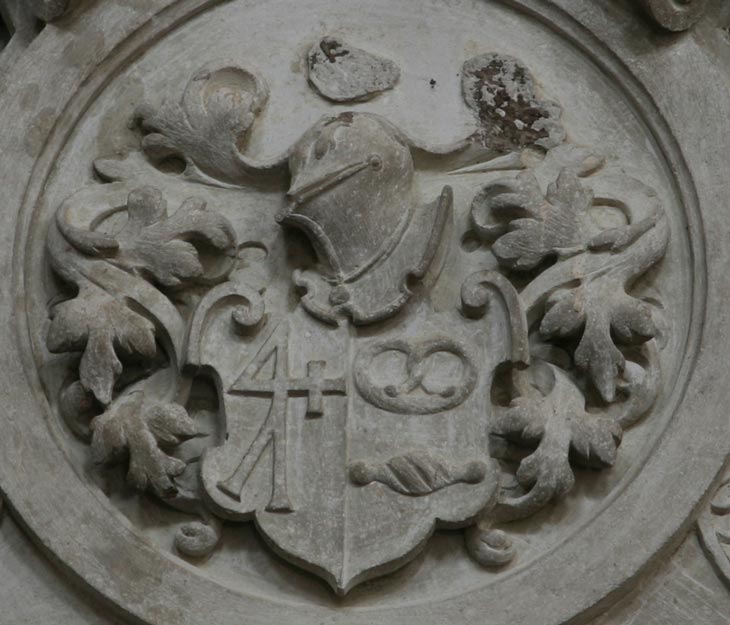 Das Wappen im Aufsatz ist ein Ehewappen, das dasjenige des Ehemannes und dasjenige der Ehefrau in einem gespaltenen Schild vereint. Beide Wappen sind typisch bürgerliche Wappen. Das Schildbild der Familie Viel zeigt eine Hausmarke, bestehend aus einem Vierkopfschaft mit gekreuzter freier Endung und mit einer vorderen Abstrebe; die Tinkturen sind unbekannt. Das Wappen der Familie Bäcker gen. Schmiedebecker ist ein redendes, das vom namengebenden Beruf abgeleitete ist, eine liegende Brezel über einem mehrfach schräg eingeritzten und an den Enden kugelförmig geformten Brötchen.
