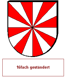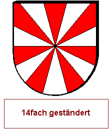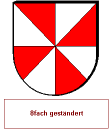 Bei einer Ständerung mit am Schildrand oder in einer Ecke liegenden Ausgangspunkt ist es nicht mehr gleichbedeutend, ob man "8fach geständert" oder "zu 8 Plätzen geständert" sagt. "Zu 8 Plätzen" meint, daß 8 unterschiedliche Farbflächen entstehen. "8fach geständert" bedeutet, daß 8 Teilungslinien vorhanden sind, ganz genauso wie ein zweimal geteilter Schild drei Plätze oder Felder erzeugt und eine dreimalige Spaltung eines Schildes 4 Farbflächen. Um eindeutig zu sein, ist die Wortwahl "zu n Plätzen" präziser und unmißverständlicher als "n-1 fach geständert". Nur bei mittigem Ausgangspunkt ist das gleichbedeutend (s.o.), weil die Anzahl der Plätze dann gleich der Anzahl der Trennlinien ist.