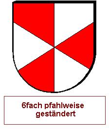 Hier eine Reihe von Ständerungen zum oberen Schildrand, die auch als Ständerung zum Schildhaupt (vgl. Wappenbilderordnung) bezeichnet wird. Eine "Ständerung zum Schildhaupt" geht bis zum Schildrand, kann auch als "Ständerung zum oberen Schildrand" bezeichnet werden und ist zu unterscheiden von der "Ständerung unter einem Schildhaupt", wo ein echtes Schildhaupt vorliegt. Analoges gilt für eine "Ständerung zum Schildfuß", die etwas anderes ist als eine "Ständerung über einem Schildfuß". Genauso sind die Begriffe "Ständerung nach oben" und "Ständerung nach unten" in Gebrauch (vgl. Leonhard).
