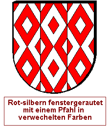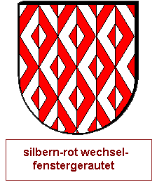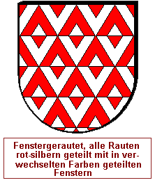 Wenn wir jetzt Fensterrauten mit Teilung und Spaltung kombinieren, erhalten wir gevierte Fensterrauten mit ganz neuen Effekten. Wir erhalten "X-Y gevierte Fensterrauten" - wegen der Einhaltung der Farbregel würde auch die Kurzform "rot-silbern fenstergerautet mit gevierten Rauten" für das erste Bildchen genügen. Einzelne Elemente können farblich abweichen, müssen dann aber im Blason einzeln hervorgehoben werden.