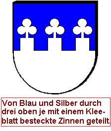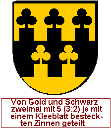 Eine beliebte Möglichkeit ist es ferner, mit den Begriffen "ausgezogen zu" oder "besteckt mit" zu arbeiten, so kann man eine normale mehr oder weniger quadratische Zinne mit beliebigen oberen Abschlüssen versehen, im Beispiel sind die Zinnen mit einem Kleeblatt besteckt.