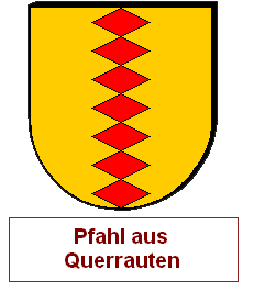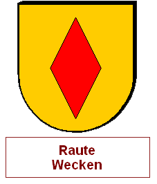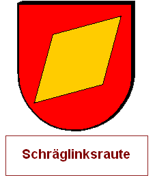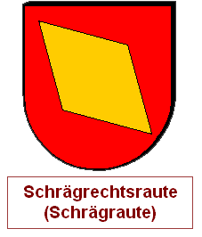 Ist das Objekt ohne rechte Winkel, aber mit vier gleichlangen Seiten und senkrecht aufeinanderstehenden Diagonalen, wird es als Raute oder Wecken angesprochen. Ohne weitere Angaben liegt eine Raute senkrecht. Eine Raute, bei der die horizontale Diagonale länger ist als die senkrechte Diagonale, wird als Querraute bezeichnet. Natürlich können Rauten auch schräg im Feld liegen, dann spricht man von Schrägrechtsraute oder Schräglinksraute. Entsprechend der Gepflogenheit, Selbsterklärendes wegzulassen, wird eine Schrägrechtsraute auch nur als Schrägraute bezeichnet, denn wenn keine Richtung angegeben ist, gilt automatisch die rechte Ausrichtung.