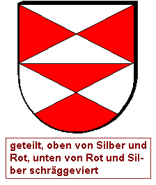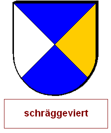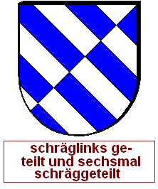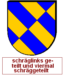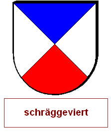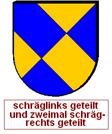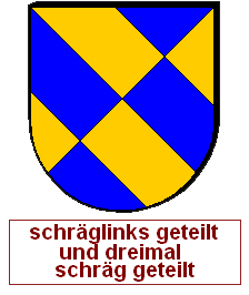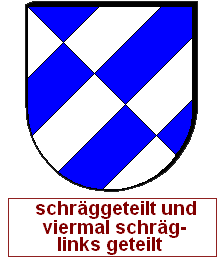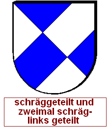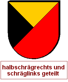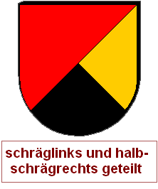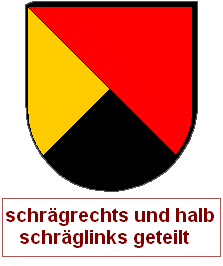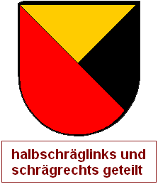 Schrägrechtsteilungen und Schräglinksteilungen können auch unvollständig miteinander zu einem asymmetrischen Heroldsbild kombiniert werden. Man erzeugt mit zwei Linien drei Felder, was aus gutem Grund nicht so beliebt ist, denn dadurch, daß an einem zentralen Punkt eine ungerade Anzahl von Linien zusammenkommt, haben wir diesen Schildbild einen unvermeidbaren Verstoß gegen die Farbregel eingepflanzt. Es gibt immer eine halbe Diagonale, wo Farbe und Farbe oder Metall und Metall zusammenstoßen müssen. Die durchgehende Diagonale wird als Schrägteilung angesprochen, die kurze Diagonale als halbe Schrägteilung. Die Richtung muß jeweils angegeben werden. Ohne Angabe gilt "rechts". Die Reihenfolge ist entscheidend, man arbeitet die Blasonierung von oben nach unten ab. Wird also eine ganze Teilung vor einer halben Teilung erwähnt, ist die kurze Diagonale in der unteren Schildhälfte und umgekehrt.