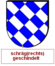 Schrägrechtsteilungen und Schräglinksteilungen können auch zu mehreren kombiniert werden. Dabei wird zuerst die Teilungsart mit der geringeren Linienanzahl genannt, dann die mit der höheren. Die zuerst genannte Farbe ist die an heraldisch oberer Position an der Ecke, an der Teilungsart mit weniger Linien ankommt, also im linken Fall der unteren Zeile: "Von Blau und Gold schräglinks geteilt und dreimal schräg(rechts) geteilt", im rechten Fall der folgenden Zeile: " Von Blau und Silber schräggeteilt und viermal schräglinks geteilt".