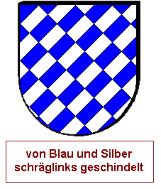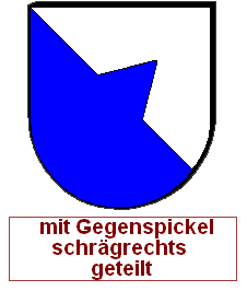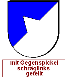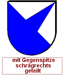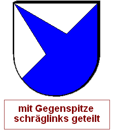 Die oben erwähnten Regeln bleiben, so wird die linke Abb. der folgenden Zeile als "Von Silber und Blau mit Gegenspitze schräggeteilt" blasoniert, zuerst die obere Farbe, dann die untere.